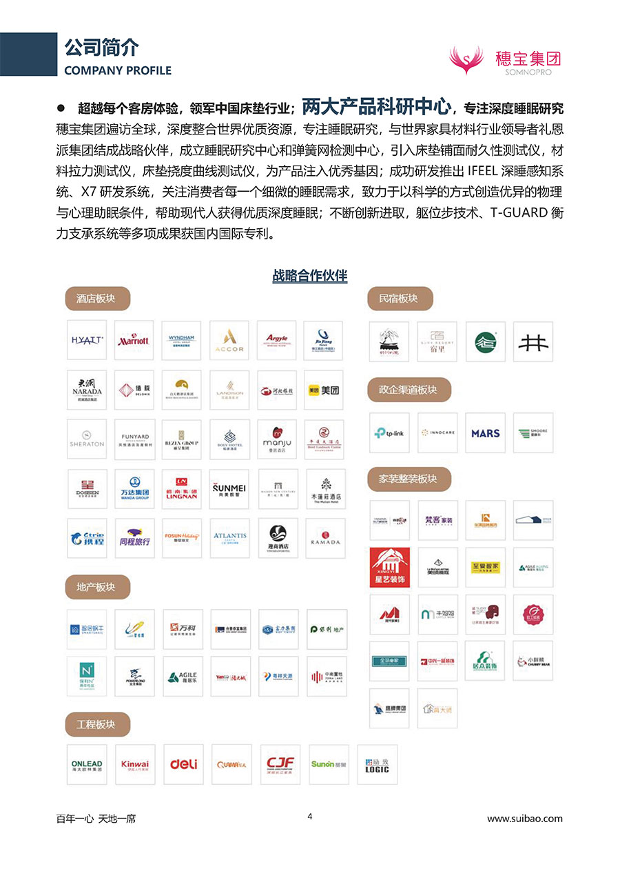 中國超過3000個銷售網點,海外網點50個穗寶集團床墊產品的銷售區(qū)域已經覆蓋全國32個省份,全球擁有超過3000個銷售網點,直接用戶超過1200萬人。100多個大型百貨品牌超過350家大型家具城及國際知名大型零售連鎖店,均是穗寶集團長期合作伙伴,床墊產品同步在售。