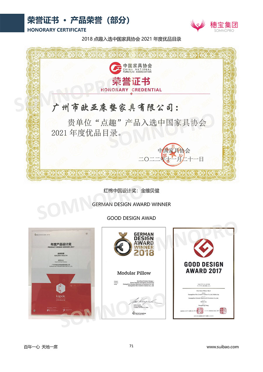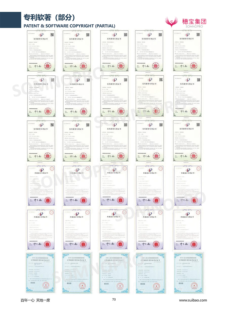 超越每個客房體驗,領軍中國床墊行業(yè);兩大產品科研中心,專注深度睡眠研究穗寶集團遍訪全球,深度整合世界優(yōu)質資源,專注睡眠研究,與世界家具材料行業(yè)領導者禮恩派集團結成戰(zhàn)略伙伴,成立睡眠研究中心和彈簧網檢測中心,引入床墊鋪面耐久性測試儀,材料拉力測試儀,床墊撓度曲線測試儀,為產品注入優(yōu)秀基因;成功研發(fā)推出IFEEL深睡感知系統(tǒng)、X7研發(fā)系統(tǒng),關注消費者每一個細微的睡眠需求,致力于以科學的方式創(chuàng)造優(yōu)異的物理與心理助眠條件,幫助現代人獲得優(yōu)質深度睡眠;不斷創(chuàng)新進取,軀位步技術、T-GUARD衡力支承系統(tǒng)等多項成果獲國內國際專利。