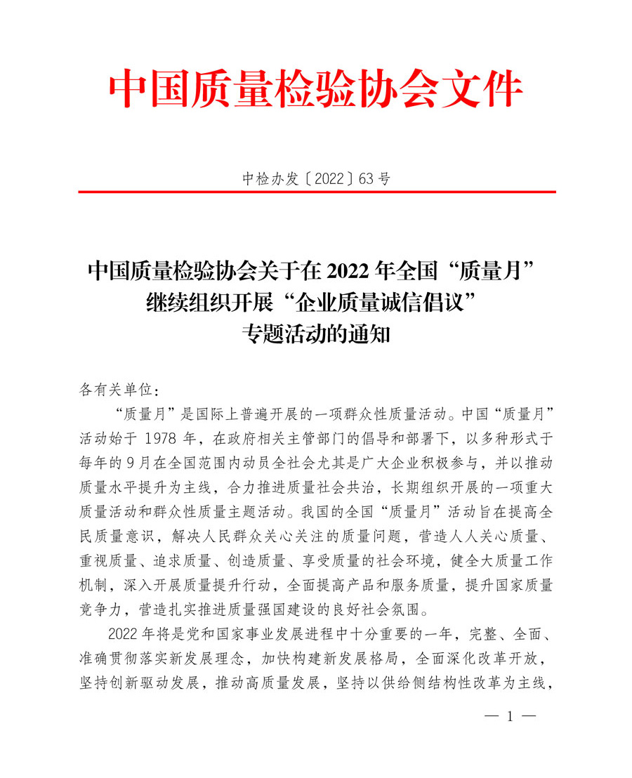 中國質(zhì)量檢驗(yàn)協(xié)會作為我國質(zhì)量檢驗(yàn)行業(yè)組織和質(zhì)量專業(yè)社團(tuán)機(jī)構(gòu),積極響應(yīng)2022年全國“質(zhì)量月”活動(dòng)部署,充分發(fā)揮推動(dòng)全社會質(zhì)量共治的橋梁紐帶作用,謹(jǐn)此組織各行各業(yè)在質(zhì)量發(fā)展、質(zhì)量提升、質(zhì)量變革、質(zhì)量創(chuàng)新、質(zhì)量誠信等方面具有良好示范作用的2000家優(yōu)秀企業(yè)共同發(fā)出《2022年全國“質(zhì)量月”企業(yè)質(zhì)量誠信倡議書》,全面樹立質(zhì)量標(biāo)桿,動(dòng)員廣大企業(yè)開展群眾性質(zhì)量活動(dòng),大力弘揚(yáng)社會主義核心價(jià)值觀,推動(dòng)形成崇尚誠信、踐行誠信的良好風(fēng)尚,營造質(zhì)量誠信社會氛圍,在全社會掀起建設(shè)質(zhì)量強(qiáng)國的熱潮。