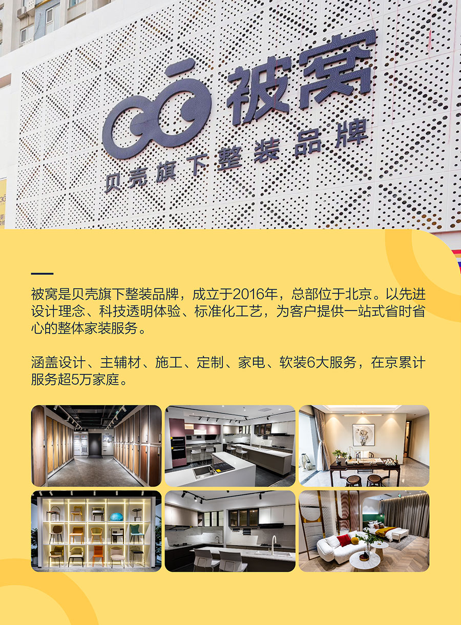 被窩,是貝殼旗下整裝品牌,成立于2016年,總部位于北京。以先進(jìn)設(shè)計(jì)理念、科技透明體驗(yàn)、標(biāo)準(zhǔn)化工藝,為客戶提供一站式省時(shí)省心的整體家裝服務(wù)。涵蓋設(shè)計(jì)、主輔材、施工、定制、家電、軟裝6大服務(wù)。