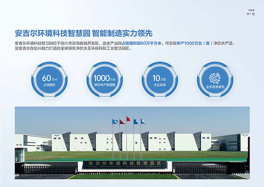 安吉爾擁有三大生產(chǎn)基地,其中安吉爾環(huán)境科技智慧園占地超60萬平方米,可實(shí)現(xiàn)年產(chǎn)1000萬臺(套)的凈飲水產(chǎn)品規(guī)模。安吉爾擁有完整的生產(chǎn)管理體系,已獲中國CQC、美國UL、美國NSF、加拿大CSA、法國BV、英國ITS、瑞士SGS和德國TüV全球八項(xiàng)權(quán)威機(jī)構(gòu)認(rèn)證。
