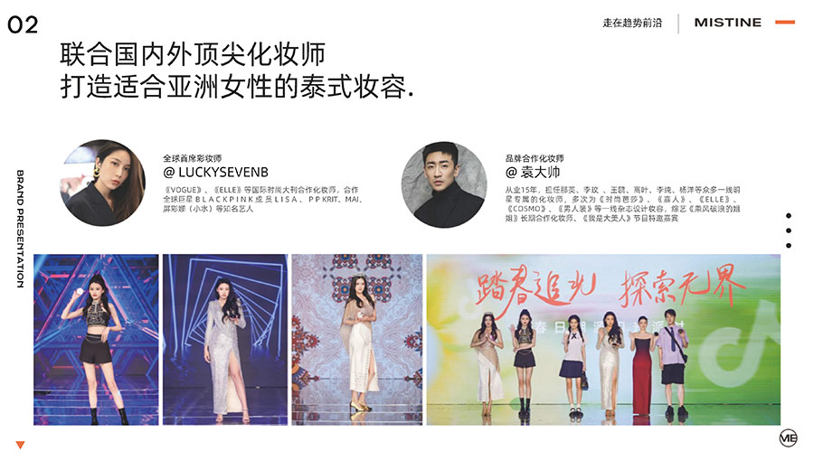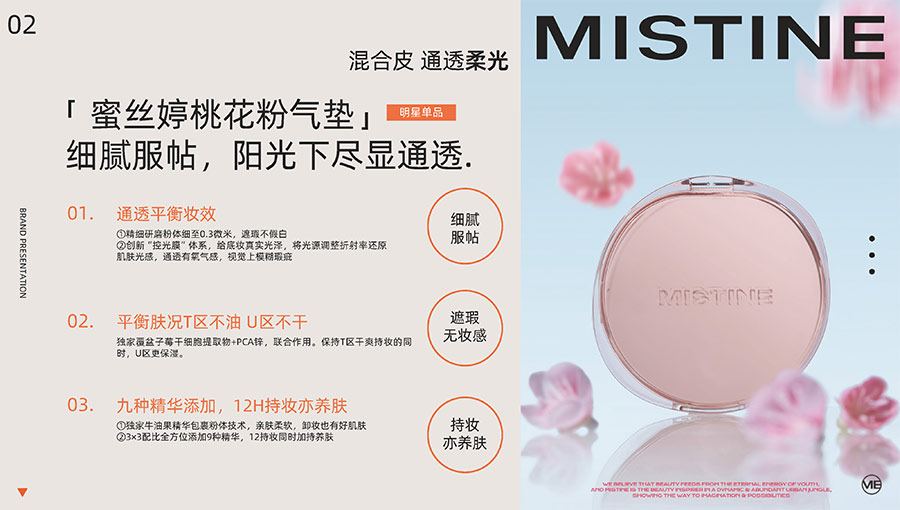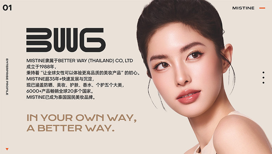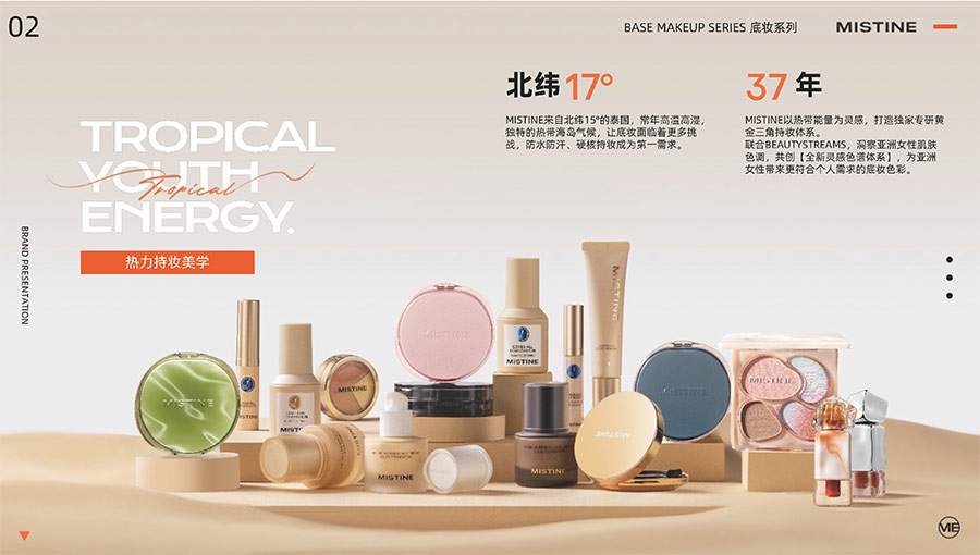 MISTINE蜜絲婷1988年始源于泰國,作為知名國際美妝品牌,擁有36年科研底蘊,產(chǎn)品種類涵蓋防曬、美妝、護膚、香水、個護五大類,擁有近6000多個單品暢銷全球20多個國家,專注為全球女性提供豐富、安全、高品質(zhì)的美妝產(chǎn)品。自2016年進入中國后,MISTINE蜜絲婷以“熱帶青春能量美妝”為品牌定位,為年輕人打造更懂得他們的全新美妝產(chǎn)品,并傳遞獨特的健康活力生活方式。