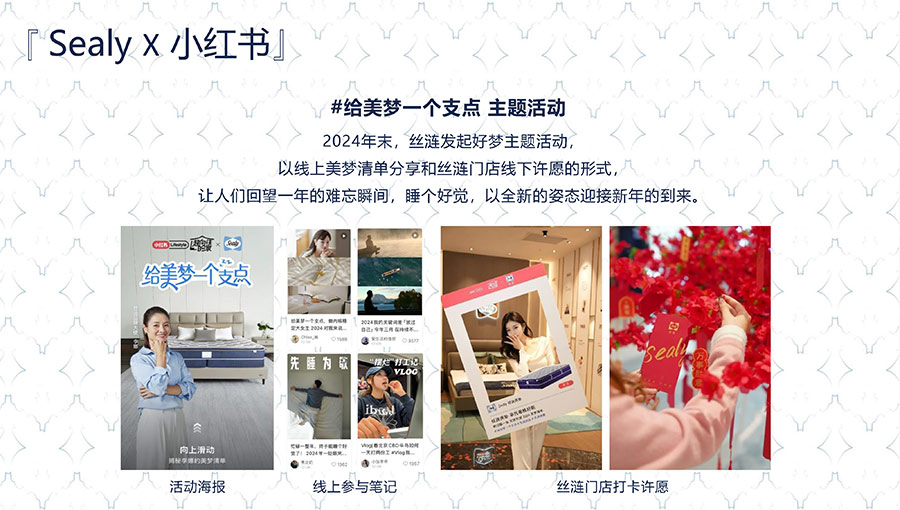 2024年末,絲漣發(fā)起好夢主題活動,以線上美夢清單分享和絲漣門店線下許愿的形式,讓人們回望一年的難忘瞬間,睡個(gè)好覺,以全新的姿態(tài)迎接新年的到來。