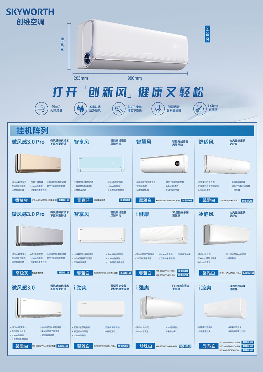 主要產(chǎn)品:SKYWORTH(創(chuàng)維)家用空調(diào)、商用空調(diào)、車(chē)用空調(diào)、廚房空調(diào)、移動(dòng)空調(diào)、凈化器等產(chǎn)品
