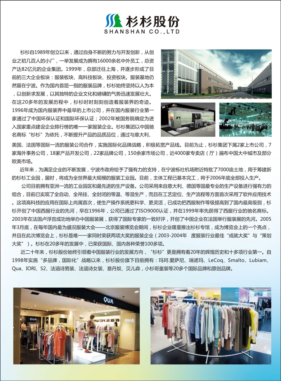 杉杉自1989年創(chuàng)立以來(lái),通過(guò)自身不斷的努力與開(kāi)發(fā)創(chuàng)新,從創(chuàng)業(yè)之初幾百人的小廠,一舉發(fā)展成為擁有16000余名中外員工,總資產(chǎn)達(dá)82億元的企業(yè)集團(tuán)。1999年,總部遷往上海,并逐步形成了目前的三大企業(yè)板塊:服裝板塊、高科技板塊、投資板塊。服裝基地仍然留在寧波。作為國(guó)內(nèi)首屈一指的服裝品牌,杉杉始終堅(jiān)持以人為本,以創(chuàng)新求發(fā)展,以其獨(dú)特的企業(yè)文化和磅礴的氣勢(shì)迅速發(fā)展壯大。在這20多年的發(fā)展歷程中,杉杉時(shí)時(shí)刻刻創(chuàng)造著服裝界的奇跡。1996年成為國(guó)內(nèi)服裝界中最早的上市公司,并在國(guó)內(nèi)服裝行業(yè)第一家通過(guò)了中國(guó)環(huán)保認(rèn)證和國(guó)際環(huán)保認(rèn)證;2002年被國(guó)務(wù)院確定為進(jìn)入國(guó)家重點(diǎn)建設(shè)企業(yè)排行榜的唯一一家服裝企業(yè)。杉杉集團(tuán)以中國(guó)馳名商標(biāo)“杉杉”為依托,不斷提升產(chǎn)品的品質(zhì)品位,通過(guò)與意大利、美國(guó)、法國(guó)等國(guó)際一流的服裝公司合作,實(shí)施國(guó)際化品牌戰(zhàn)略,積極拓寬產(chǎn)品線。目前為止,杉杉集團(tuán)下屬2家上市公司,7家海外事務(wù)公司,18家產(chǎn)品開(kāi)發(fā)公司,22家品牌公司,150余家市場(chǎng)公司,近4000家專(zhuān)賣(mài)店(廳)遍布中國(guó)大中城市及部分歐美市場(chǎng)。
