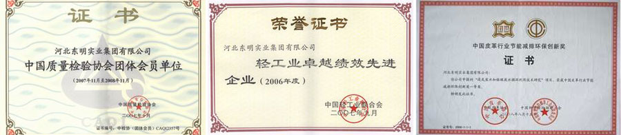 河北東明實業(yè)集團有限公司創(chuàng)建于1996年,集團下屬河北東明皮革有限公司、河北東明制衣有限公司、河北東明牛皮制革有限公司、東明金興制衣有限公司、東明酒店、東明商廈、河北東明中硅科技有限公司、辛集市東明房地產開發(fā)有限公司八個子公司。集團是按高標準、高起點、嚴要求興建的辛集地方特色產業(yè),經過幾年的不懈努力,已發(fā)展成擁有職工3000人,制革能力和產量在全國制革業(yè)中居前位,其中綿羊皮服裝革產銷量列第一位的中型民營企業(yè)。獲得國家星火計劃獎、國家農副產品加工龍頭企業(yè)、國家優(yōu)秀鄉(xiāng)鎮(zhèn)企業(yè)、全國外商投資先進企業(yè)、全國雙愛雙評先進企業(yè);獲河北省著名商標、河北省名牌、河北省質量效益型先進企業(yè)、河北省重合同守信用單位、河北省百強企業(yè)和石家莊市50強企業(yè)等80多個國家級獎項和榮譽稱號。集團在皮革行業(yè)樹立的良好聲譽使東明成為高品質的代名詞,可信賴的經營作風更獲得世界各地客戶贊賞!集團近年來不斷加大技改投入,先后投入3個億人民幣進行技術改造,投入2000萬進行環(huán)保污水處理,經過不斷的創(chuàng)新改造,在環(huán)境保護和環(huán)境治理上取得了可喜成就。其中,無灰浸鞣、廢灰夜循環(huán)利用、廢鉻液循環(huán)利用工藝技術,獲河北省科技廳科技成果獎,并在全國皮革行業(yè)推廣,取得豐厚的企業(yè)經濟效益和社會效益。2009年獲全國輕工行業(yè)“節(jié)能減排環(huán)保創(chuàng)新獎”。獲得全國“五一勞動獎狀”。河北東明實業(yè)集團有限公司產品質量獲得國家真皮生態(tài)皮革稱號、辛集市利稅大戶。近年來向社會捐資500萬用于公益事業(yè)。現在集團勞動關系和諧,曾被國家評為“雙評雙愛”先進單位。多次被省評為“重合同守信用”企業(yè),客戶對產品質量滿意率一直在99%以上,客戶對產品售后服務滿意度在99%以上。集團成立以來致力于生產高質量的產品,“以誠信為根本,視質量為生命”是東明人一貫遵循的準則,也正是對這一目標的不懈追求使公司不斷的發(fā)展壯大。集團生產的綿羊服裝革,以其色澤均勻、手感柔軟著稱,不僅在國內有很高的聲譽,還贏得了國外許多廠家的青睞,已打入美國、加拿大、韓國、俄羅斯、香港等國外市場。