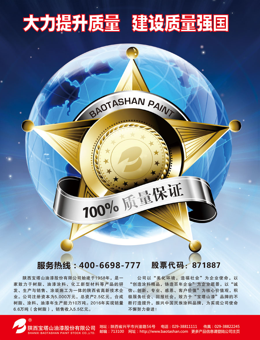 寶塔山漆以“美化環(huán)境,造福社會”為企業(yè)使命,以“創(chuàng)造涂料精品,鑄造百年企業(yè)”為企業(yè)愿景,以“誠信、創(chuàng)新、專業(yè)、感恩、客戶價值”為核心價值觀,積極服務(wù)社會、回報社會,致力于“寶塔山漆”品牌的不斷打造提升,振興中國民族涂料品牌,為實現(xiàn)公司使命不懈努力奮進(jìn)!