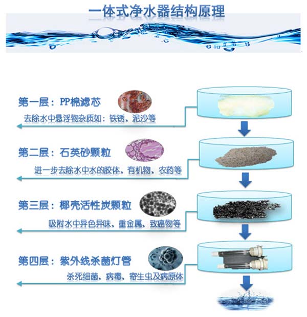 鄧凈公司主打產(chǎn)品,鄧凈牌凈水機(jī)YCZ-QT8-DJ01。鄧凈凈水機(jī)YCZ-QT8-DJ01以生物慢濾為原型,采用純物理凈化原理和漸進(jìn)式結(jié)構(gòu)即纖維素濾芯+石英石+活性炭+紫外線消毒四級(jí)過濾,通過截留、沉降、吸附和殺菌等作用,有效地凈化水源,改善飲用水安全。