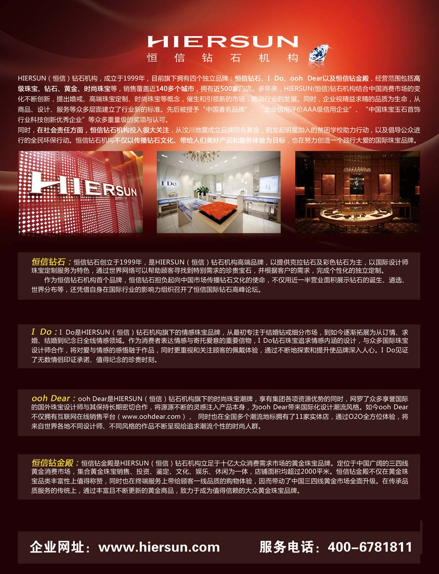 主要產(chǎn)品:HIERSUN(恒信)、I Do、ooh Dear、恒信鉆金殿品牌產(chǎn)品