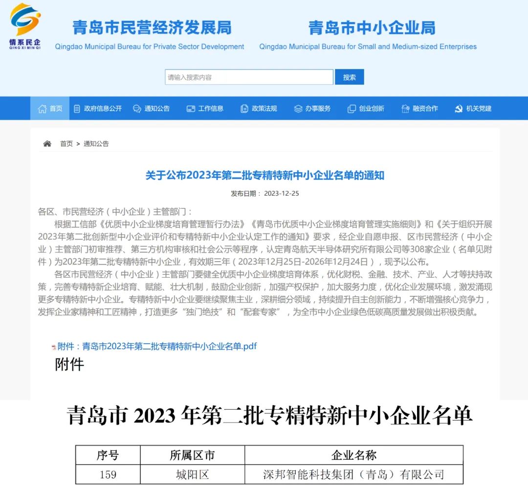 12月25日,青島市民營經(jīng)濟(jì)發(fā)展局發(fā)布了《關(guān)于公示2023年第二批專精特新中小企業(yè)名單的通知》,深邦集團(tuán)憑借卓越的創(chuàng)新技術(shù)、完善的產(chǎn)品體系、高效的運營模式以及穩(wěn)健的經(jīng)營實力順利通過層層審核,獲評2023年第二批“專精特新”中小企業(yè)。