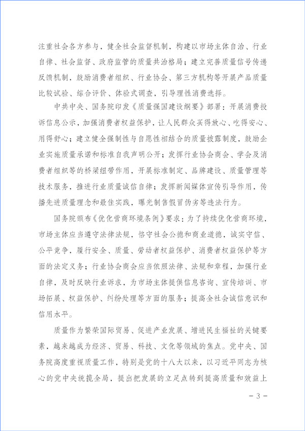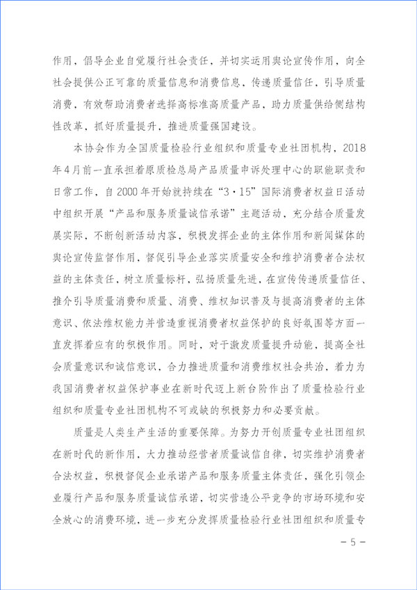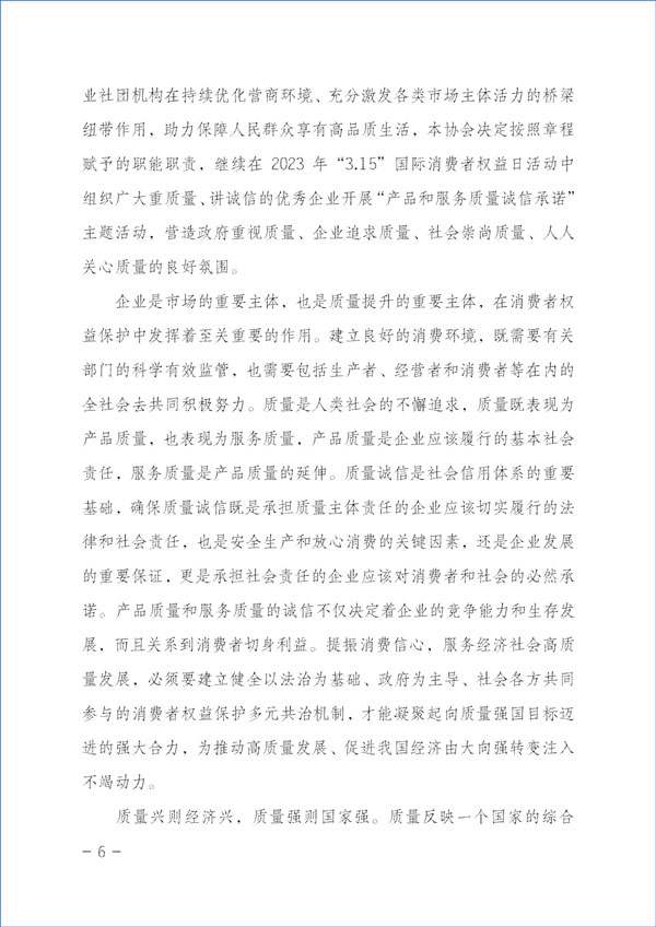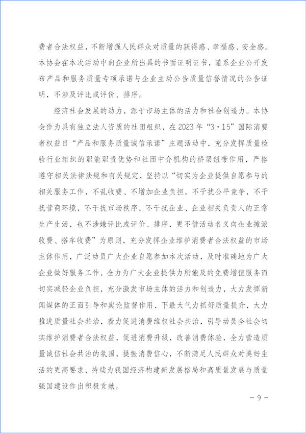 經濟社會發(fā)展的動力,源于市場主體的活力和社會創(chuàng)造力。本協(xié)會作為具有獨立法人資質的社團組織,在2023年“3·15”國際消費者權益日“產品和服務質量誠信承諾”主題活動中,充分發(fā)揮質量檢驗行業(yè)組織的職能職責優(yōu)勢和社團中介機構的橋梁紐帶作用,嚴格遵守相關法律法規(guī)和有關規(guī)定,堅持以“切實為企業(yè)提供自愿參與的相關服務工作,不亂收費、不增加企業(yè)負擔,不干擾公平競爭,不干擾營商環(huán)境,不干擾市場秩序,不干擾企業(yè)、企業(yè)相關負責人的正常生產生活,也不涉嫌評比或評價、排序,更不借活動名義向企業(yè)攤派收費、搭車收費”為原則,充分發(fā)揮企業(yè)維護消費者合法權益的市場主體作用,廣泛動員廣大企業(yè)自愿參加本次活動,及時準確地為廣大企業(yè)做好服務工作,全力為廣大企業(yè)提供力所能及的免費增值服務而切實減輕企業(yè)負擔,充分激發(fā)市場主體的活力和創(chuàng)造力,大力發(fā)揮新聞媒體的正面引導和輿論監(jiān)督作用,下最大氣力抓好質量提升,大力推進質量社會共治,著力促進消費維權社會共治,引導動員全社會切實維護消費者合法權益,促進消費升級,改善消費體驗,全力營造質量誠信社會共治的氛圍,提振消費信心,不斷滿足人民群眾對美好生活的更高要求,持續(xù)為我國經濟構建新發(fā)展格局和高質量發(fā)展與質量強國建設作出積極貢獻。