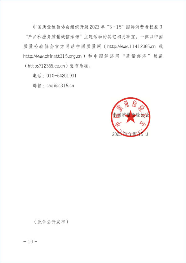 中國質量檢驗協(xié)會組織開展2023年“3·15”國際消費者權益日“產品和服務質量誠信承諾”主題活動的其它相關事宜,一律以中國質量檢驗協(xié)會官方網站中國質量網(http://www.11412365.cn或http://www.chinatt315.org.cn)和中國經濟網“質量經濟”頻道(http://12365.ce.cn)發(fā)布為準。