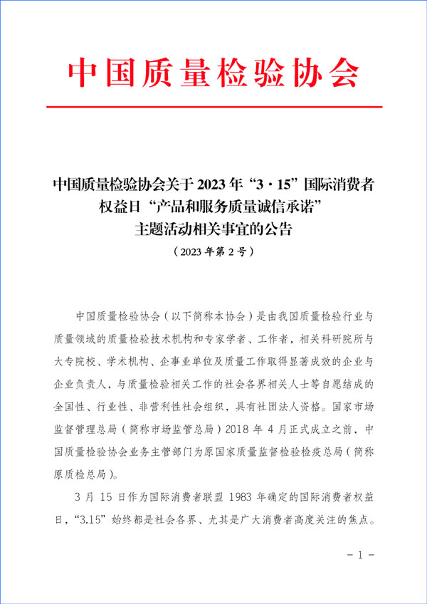 中國質量檢驗協(xié)會關于組織開展2023年“3·15”活動的公告(2023年第2號)