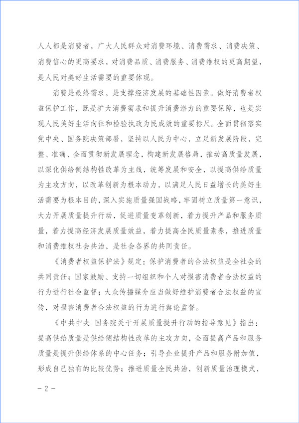 消費是最終需求,是支撐經濟發(fā)展的基礎性因素。做好消費者權益保護工作,既是擴大消費需求和提升消費潛力的重要保障,也是實現(xiàn)人民美好生活向往和檢驗執(zhí)政為民成效的重要標尺。全面貫徹落實黨中央、國務院決策部署,堅持以人民為中心,立足新發(fā)展階段,完整、準確、全面貫徹新發(fā)展理念,構建新發(fā)展格局,推動高質量發(fā)展,以深化供給側結構性改革為主線,統(tǒng)籌發(fā)展和安全,以提高供給質量為主攻方向,以改革創(chuàng)新為根本動力,以滿足人民日益增長的美好生活需要為根本目的,深入實施質量強國戰(zhàn)略,牢固樹立質量第一意識,大力開展質量提升行動,促進質量變革創(chuàng)新,著力提升產品和服務質量,著力提高經濟發(fā)展質量效益,著力提高全民質量素養(yǎng),推進質量和消費維權社會共治,是社會各界的共同責任。