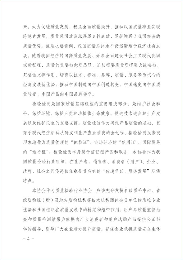 檢驗檢測是國家質量基礎設施的重要組成部分,是維護社會和平、保護環(huán)境、保護人類和動植物生命健康、促進技術進步和生產發(fā)展以及維護民生的重要支撐。質量檢驗作為確保產品質量的基礎,貫穿于現(xiàn)代經濟活動從研發(fā)到生產直至消費的全過程,檢驗檢測報告被形象地稱為質量管理的“體檢證”、市場經濟的“信用證”、國際貿易的“通行證”。檢驗檢測本身屬于信任型產品和服務,本協(xié)會作為我國質量檢驗行業(yè)組織,在生產者、銷售者、消費者(用戶)、企業(yè)、政府、社會之間傳遞信任也是其應有的“傳遞信任,服務發(fā)展”職能特點。