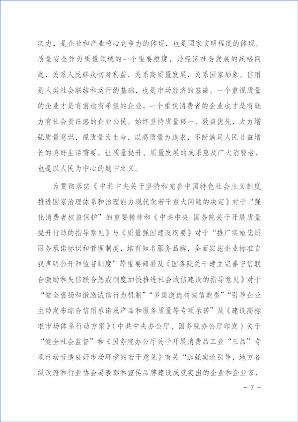 質量興則經濟興,質量強則國家強。質量反映一個國家的綜合實力,是企業(yè)和產業(yè)核心競爭力的體現(xiàn),也是國家文明程度的體現(xiàn)。質量安全作為質量領域的一個重要維度,是經濟社會發(fā)展的戰(zhàn)略問題,關系人民群眾切身利益,關系高質量發(fā)展,關系國家形象。信用是人類社會聯(lián)結和運行的基礎,也是市場經濟的基礎。一個重視質量的企業(yè)才是有前途有希望的企業(yè),一個重視消費者的企業(yè)也才是有魅力有社會責任感的企業(yè)公民。始終堅持質量第一、效益優(yōu)先,大力增強質量意識,視質量為生命,以高質量為追求,不斷滿足人民日益增長的美好生活需要,讓質量提升、質量發(fā)展的成果惠及廣大消費者,也是以人民為中心的題中之義。