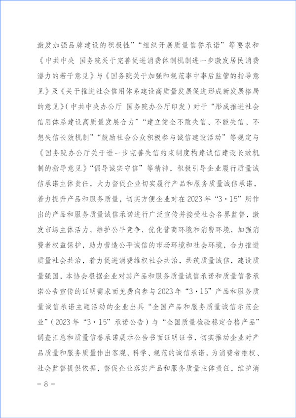 為貫徹落實《中共中央關于堅持和完善中國特色社會主義制度 推進國家治理體系和治理能力現(xiàn)代化若干重大問題的決定》對于“強化消費者權益保護”的重要精神和《中共中央 國務院關于開展質量提升行動的指導意見》與《質量強國建設綱要》對于“推廣實施優(yōu)質服務承諾標識和管理制度,培育知名服務品牌,全面實施企業(yè)標準自我聲明公開和監(jiān)督制度”等重要部署及《國務院關于建立完善守信聯(lián)合激勵和失信聯(lián)合懲戒制度加快推進社會誠信建設的指導意見》對于“健全褒揚和激勵誠信行為機制”“多渠道選樹誠信典型”“引導企業(yè)主動發(fā)布綜合信用承諾或產品和服務質量等專項承諾”及《建設高標準市場體系行動方案》(中共中央辦公廳、國務院辦公廳印發(fā))關于“健全社會監(jiān)督”和《國務院辦公廳關于開展消費品工業(yè)“三品”專項行動營造良好市場環(huán)境的若干意見》有關“加強輿論引導,地方各級政府和行業(yè)協(xié)會要表彰和宣傳品牌建設成就突出的企業(yè)和企業(yè)家,激發(fā)加強品牌建設的積極性”“組織開展質量信譽承諾”等要求和《中共中央 國務院關于完善促進消費體制機制進一步激發(fā)居民消費潛力的若干意見》與《國務院關于加強和規(guī)范事中事后監(jiān)管的指導意見》及《關于推進社會信用體系建設高質量發(fā)展促進形成新發(fā)展格局的意見》(中共中央辦公廳 國務院辦公廳印發(fā))對于“形成推進社會信用體系建設高質量發(fā)展合力”“建立健全不敢失信、不能失信、不想失信長效機制”“鼓勵社會公眾積極參與誠信建設活動”等規(guī)定與《國務院辦公廳關于進一步完善失信約束制度構建誠信建設長效機制的指導意見》“倡導誠實守信”等精神,積極引導企業(yè)履行質量誠信承諾主體責任,大力督促企業(yè)切實履行產品和服務質量誠信承諾,著力提升產品和服務質量,切實方便企業(yè)對在2023年“3·15”所作出的產品和服務質量誠信承諾進行廣泛宣傳并接受社會各界監(jiān)督,激發(fā)市場主體活力,維護公平競爭,優(yōu)化營商環(huán)境和消費環(huán)境,加強消費者權益保護,助力營造公平誠信的市場環(huán)境和社會環(huán)境,合力推進質量社會共治,著力促進消費維權社會共治,共筑質量誠信,建設質量強國,本協(xié)會根據(jù)企業(yè)對其產品和服務質量誠信承諾和質量信譽承諾公告宣傳的證明需求而免費向參與2023年“3·15”產品和服務質量誠信承諾主題活動的企業(yè)出具“全國產品和服務質量誠信示范企業(yè)”(2023年“3·15”承諾公告)與“全國質量檢驗穩(wěn)定合格產品”調查匯總和質量信譽承諾展示公告書面證明證書,切實推動企業(yè)對產品質量和服務質量作出客觀、科學、規(guī)范的誠信承諾,為消費者維權、社會監(jiān)督提供依據(jù),督促企業(yè)落實產品和服務質量主體責任,維護消費者合法權益,不斷增強人民群眾對質量的獲得感、幸福感、安全感。本協(xié)會在本次活動中向企業(yè)所出具的書面證明證書,謹系企業(yè)公開發(fā)布產品和服務質量專項承諾與企業(yè)主動公告質量信譽情況的公告證明,不涉及評比或評價、排序。
