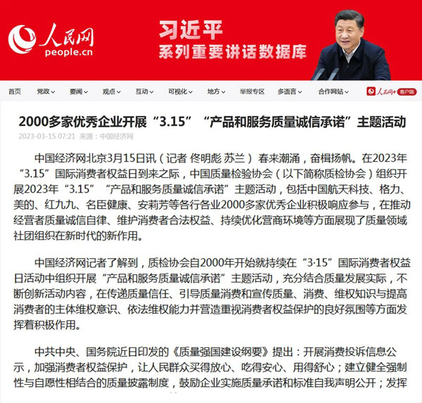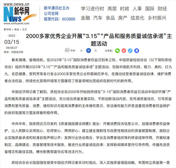 中國經(jīng)濟網(wǎng)北京3月16日訊 (記者 佟明彪 蘇蘭) 東風(fēng)浩蕩滿眼春,萬里征途惟奮進。全國兩會閉幕,高質(zhì)量發(fā)展嶄新啟航。在“3.15”國際消費者權(quán)益日到來之際,中國質(zhì)量檢驗協(xié)會(以下簡稱質(zhì)檢協(xié)會)組織開展2023年“3.15”產(chǎn)品和服務(wù)質(zhì)量誠信承諾主題活動,吸引了包括中國航天科技、格力、美的、紅九九、名臣健康、安莉芳等各行各業(yè)2000多家優(yōu)秀典范企業(yè)積極參與,在推動經(jīng)營者質(zhì)量誠信自律,維護消費者合法權(quán)益,持續(xù)優(yōu)化營商環(huán)境等方面展現(xiàn)了質(zhì)量領(lǐng)域社團組織在新時代的責(zé)任擔(dān)當(dāng)。