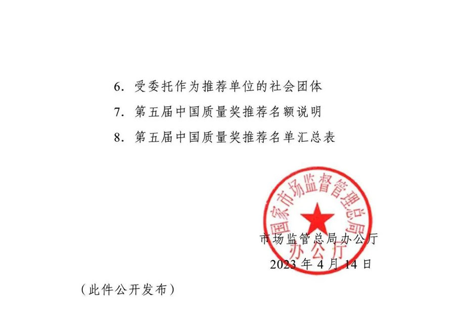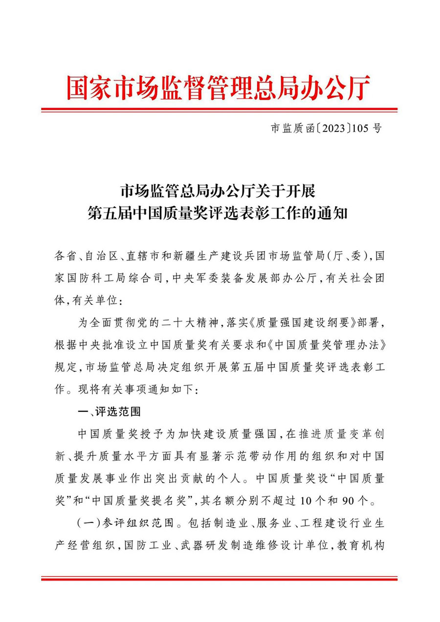 為全面貫徹黨的二十大精神,落實《質(zhì)量強國建設綱要》部署,根據(jù)中央批準設立中國質(zhì)量獎有關要求和《中國質(zhì)量獎管理辦法》規(guī)定,市場監(jiān)管總局決定組織開展第五屆中國質(zhì)量獎評選表彰工作。現(xiàn)將有關事項通知如下: