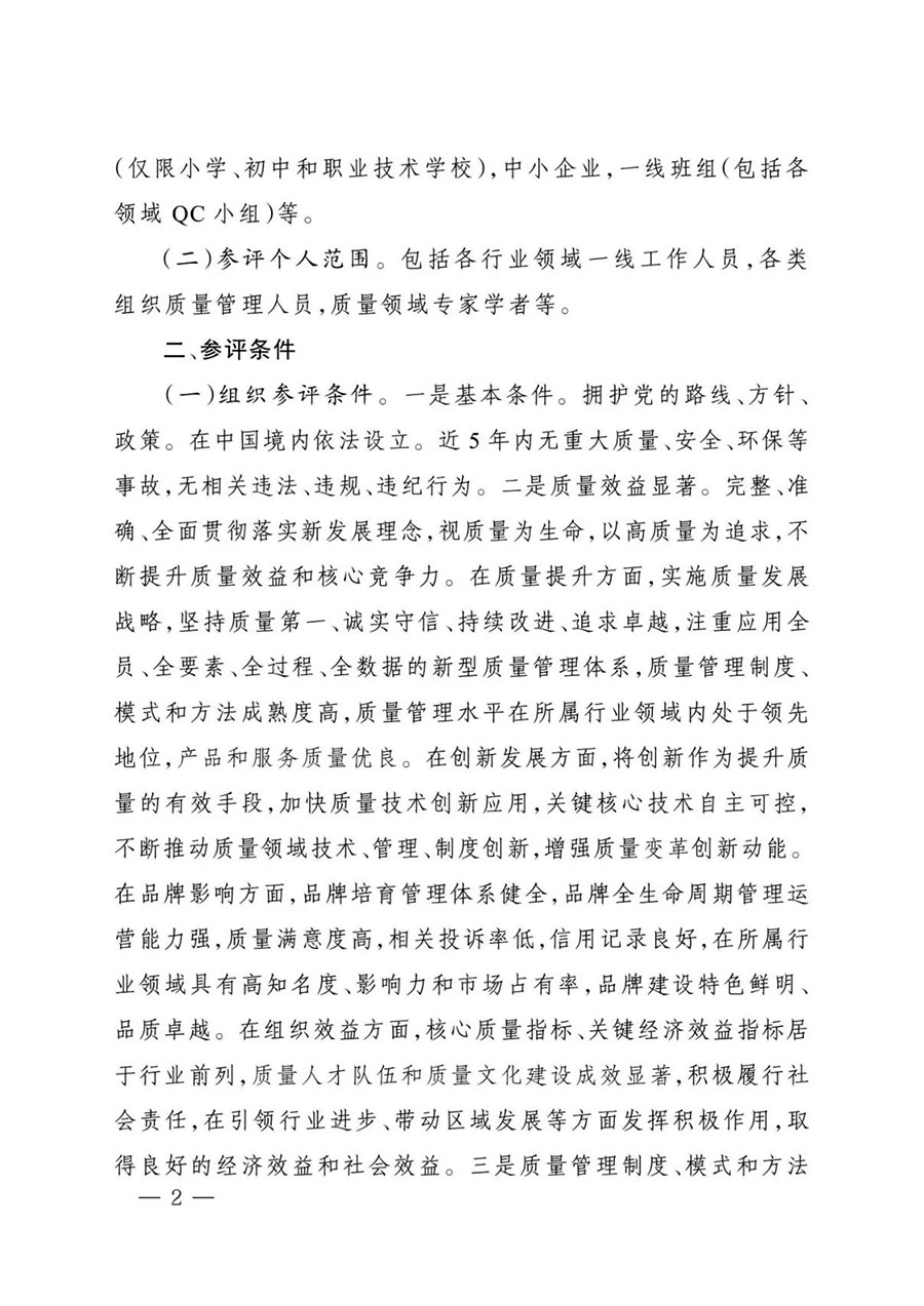 (一)組織參評條件。一是基本條件。擁護黨的路線、方針、政策。在中國境內(nèi)依法設立。近5年內(nèi)無重大質(zhì)量、安全、環(huán)保等事故,無相關違法、違規(guī)、違紀行為。二是質(zhì)量效益顯著。完整、準確、全面貫徹落實新發(fā)展理念,視質(zhì)量為生命,以高質(zhì)量為追求,不斷提升質(zhì)量效益和核心競爭力。在質(zhì)量提升方面,實施質(zhì)量發(fā)展戰(zhàn)略,堅持質(zhì)量第一、誠實守信、持續(xù)改進、追求卓越,注重應用全員、全要素、全過程、全數(shù)據(jù)的新型質(zhì)量管理體系,質(zhì)量管理制度、模式和方法成熟度高,質(zhì)量管理水平在所屬行業(yè)領域內(nèi)處于領先地位,產(chǎn)品和服務質(zhì)量優(yōu)良。在創(chuàng)新發(fā)展方面,將創(chuàng)新作為提升質(zhì)量的有效手段,加快質(zhì)量技術(shù)創(chuàng)新應用,關鍵核心技術(shù)自主可控,不斷推動質(zhì)量領域技術(shù)、管理、制度創(chuàng)新,增強質(zhì)量變革創(chuàng)新動能。在品牌影響方面,品牌培育管理體系健全,品牌全生命周期管理運營能力強,質(zhì)量滿意度高,相關投訴率低,信用記錄良好,在所屬行業(yè)領域具有高知名度、影響力和市場占有率,品牌建設特色鮮明、品質(zhì)卓越。在組織效益方面,核心質(zhì)量指標、關鍵經(jīng)濟效益指標居于行業(yè)前列,質(zhì)量人才隊伍和質(zhì)量文化建設成效顯著,積極履行社會責任,在引領行業(yè)進步、帶動區(qū)域發(fā)展等方面發(fā)揮積極作用,取得良好的經(jīng)濟效益和社會效益。三是質(zhì)量管理制度、模式和方法可示范可推廣。通過質(zhì)量管理創(chuàng)新,結(jié)合實踐總結(jié)提煉出獨具特色、國內(nèi)領先、國際先進且具有應用推廣價值的質(zhì)量管理制度、模式和方法。發(fā)揮引領作用,將質(zhì)量管理的成功經(jīng)驗和先進方法向全行業(yè)和產(chǎn)業(yè)鏈兩端延伸推廣,推動加強全面質(zhì)量管理,促進質(zhì)量升級,為建設現(xiàn)代化產(chǎn)業(yè)體系作出貢獻。