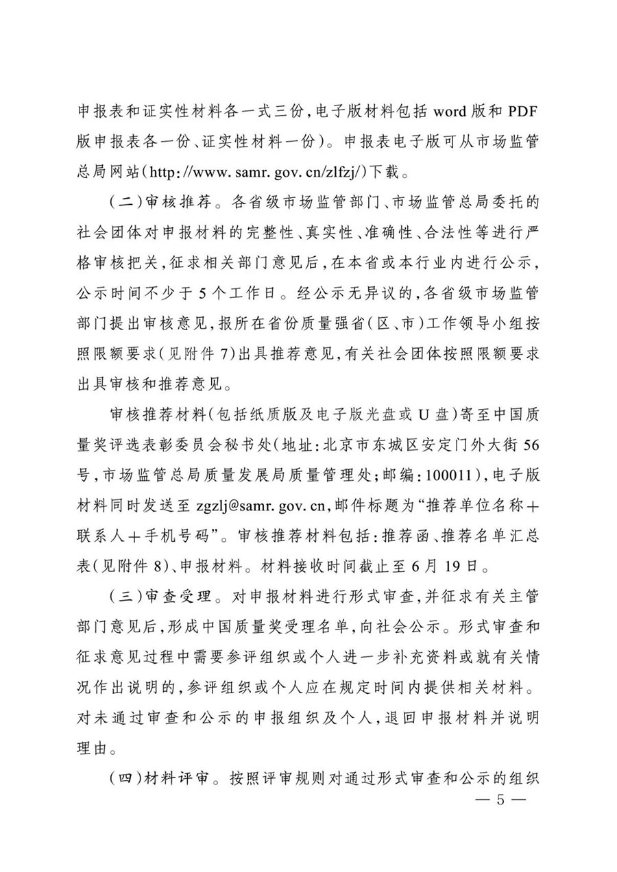 審核推薦材料(包括紙質(zhì)版及電子版光盤或U盤)寄至中國質(zhì)量獎評選表彰委員會秘書處(地址:北京市東城區(qū)安定門外大街56號,市場監(jiān)管總局質(zhì)量發(fā)展局質(zhì)量管理處;郵編:100011),電子版材料同時發(fā)送至zgzlj@samr.gov.cn,郵件標題為“推薦單位名稱+聯(lián)系人+手機號碼”。審核推薦材料包括:推薦函、推薦名單匯總表(見附件8)、申報材料。材料接收時間截止至6月19日。