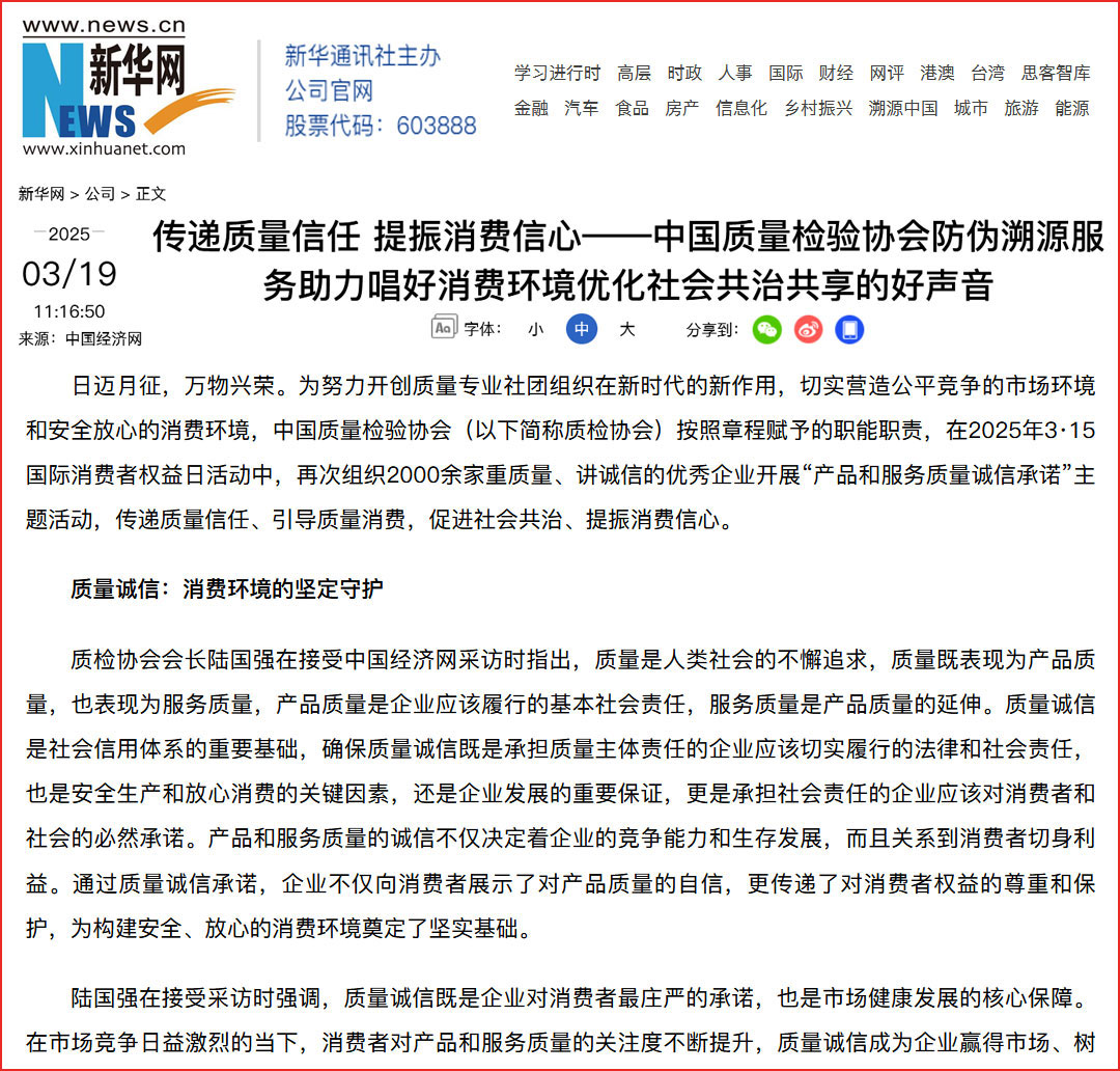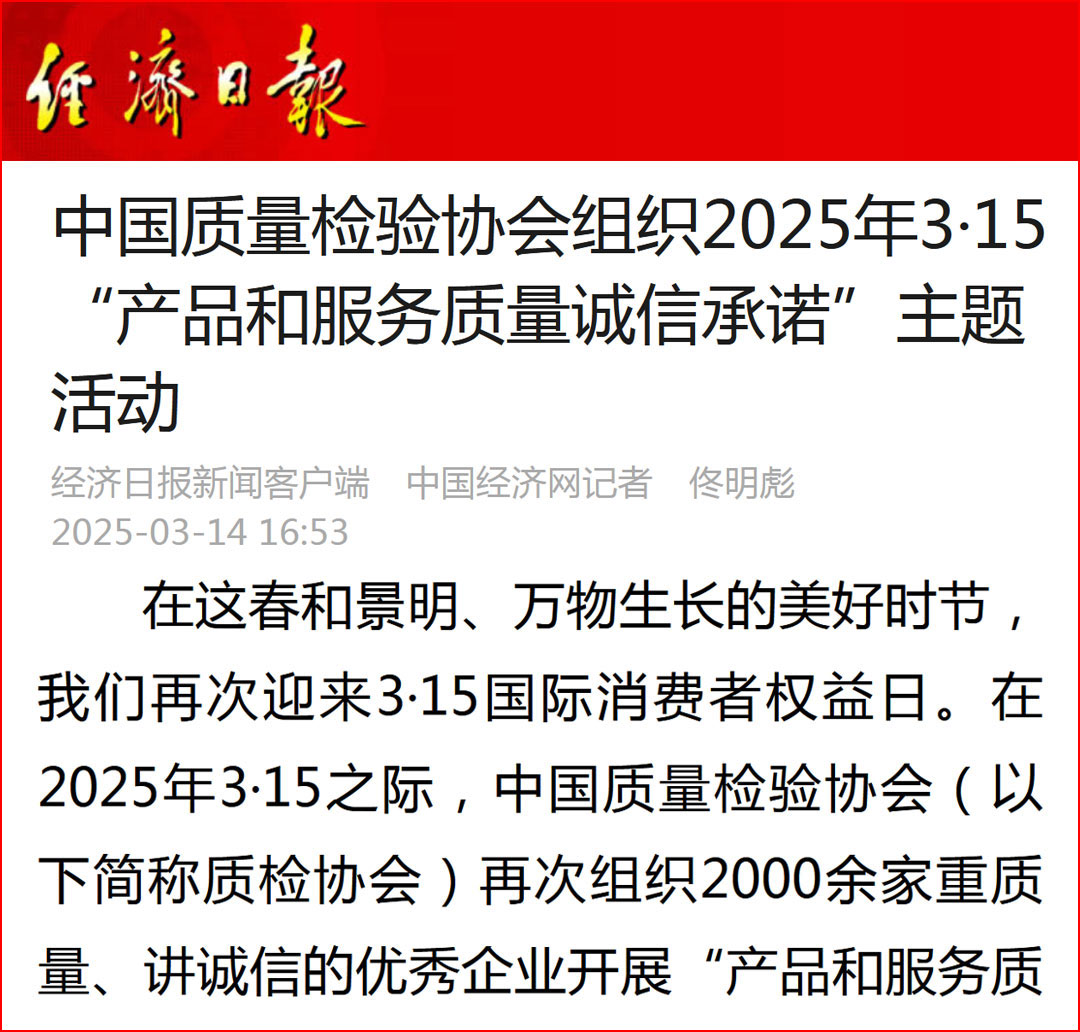 中國經(jīng)濟(jì)網(wǎng)“質(zhì)量經(jīng)濟(jì)頻道”發(fā)布:質(zhì)量誠信承諾:消費(fèi)環(huán)境和消費(fèi)維權(quán)優(yōu)化社會共治的基石——中國質(zhì)量檢驗(yàn)協(xié)會組織2000余家優(yōu)秀企業(yè)開展2025年3·15“產(chǎn)品和服務(wù)質(zhì)量誠信承諾”主題活動
