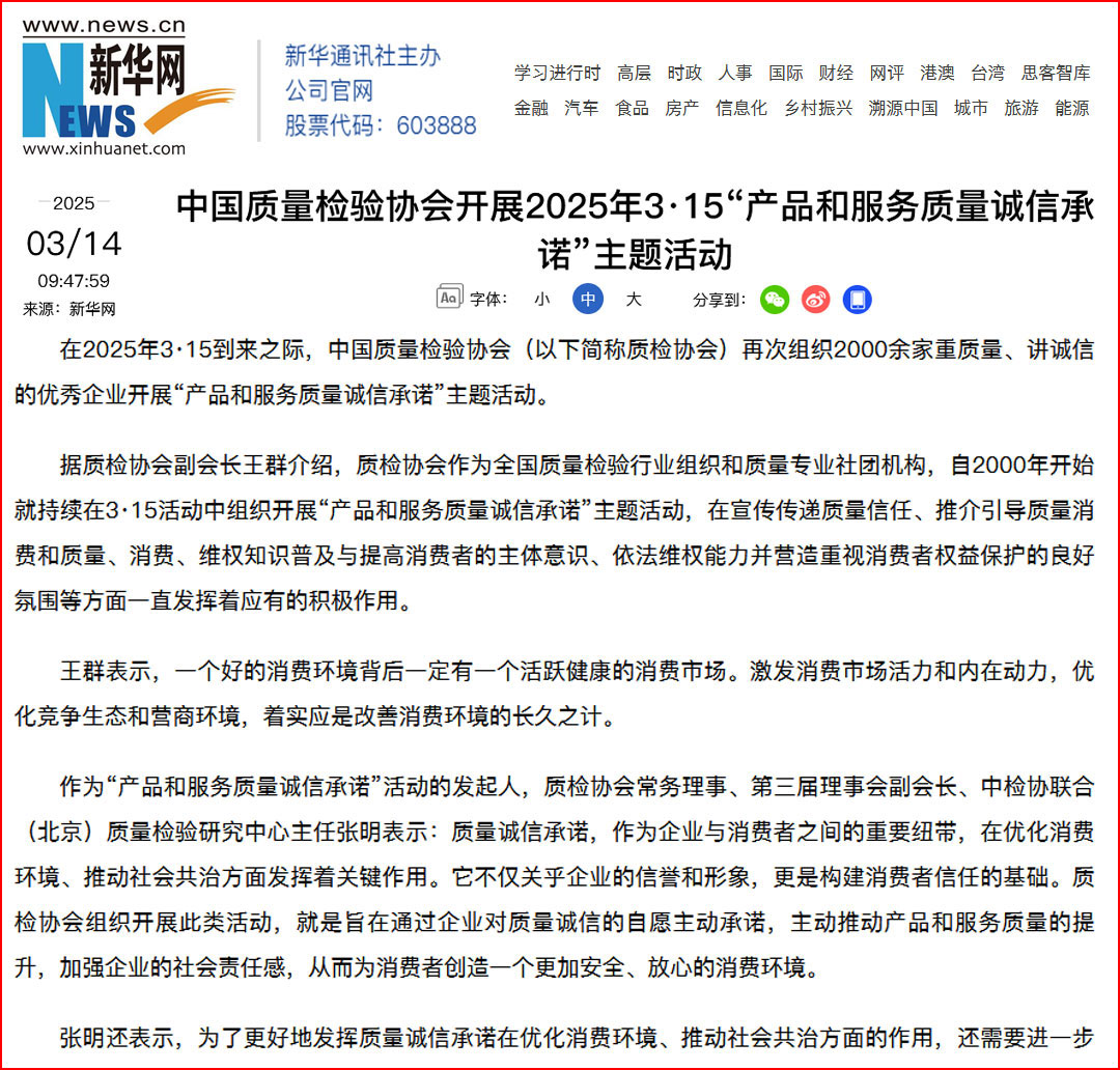 網(wǎng)易網(wǎng)報(bào)道:質(zhì)量誠信承諾助力消費(fèi)環(huán)境優(yōu)化社會共治——中國質(zhì)量檢驗(yàn)協(xié)會組織2025年3·15“產(chǎn)品和服務(wù)質(zhì)量誠信承諾”主題活動