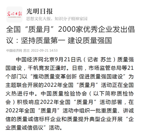 中國經(jīng)濟(jì)網(wǎng):匯聚力量攜手抓好質(zhì)量提升 肩負(fù)使命促進(jìn)質(zhì)量強(qiáng)國建設(shè)——2022年全國“質(zhì)量月”企業(yè)質(zhì)量誠信倡議活動(dòng)綜述