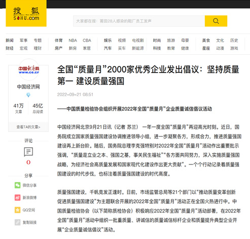 搜狐網(wǎng):匯聚力量攜手抓好質(zhì)量提升 肩負(fù)使命促進(jìn)質(zhì)量強(qiáng)國建設(shè)——2022年全國“質(zhì)量月”企業(yè)質(zhì)量誠信倡議活動(dòng)綜述