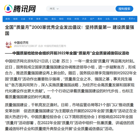 騰訊網(wǎng):匯聚力量攜手抓好質(zhì)量提升 肩負(fù)使命促進(jìn)質(zhì)量強(qiáng)國建設(shè)——2022年全國“質(zhì)量月”企業(yè)質(zhì)量誠信倡議活動(dòng)綜述