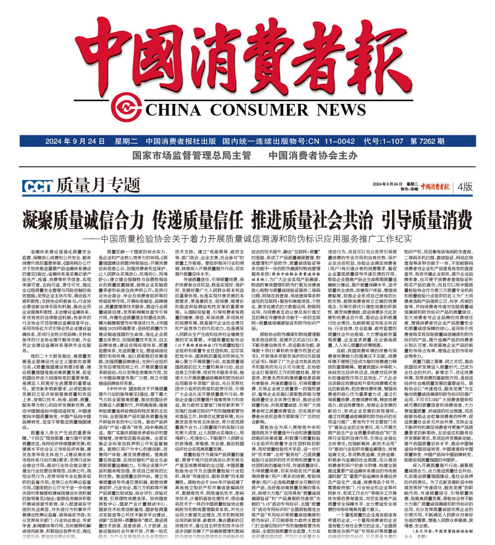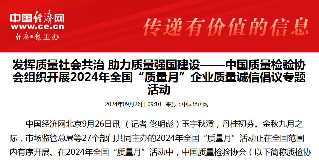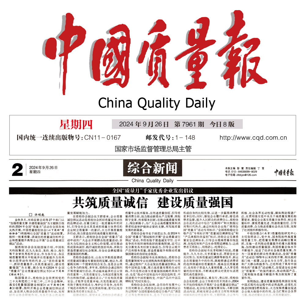 - 中國(guó)質(zhì)量報(bào)—堅(jiān)持質(zhì)量第一推動(dòng)質(zhì)量社會(huì)共治 助力質(zhì)量強(qiáng)國(guó)建設(shè)——中國(guó)質(zhì)量檢驗(yàn)協(xié)會(huì)組織開(kāi)展2024年全國(guó)“質(zhì)量月” 企業(yè)質(zhì)量誠(chéng)信倡議專(zhuān)題活動(dòng)