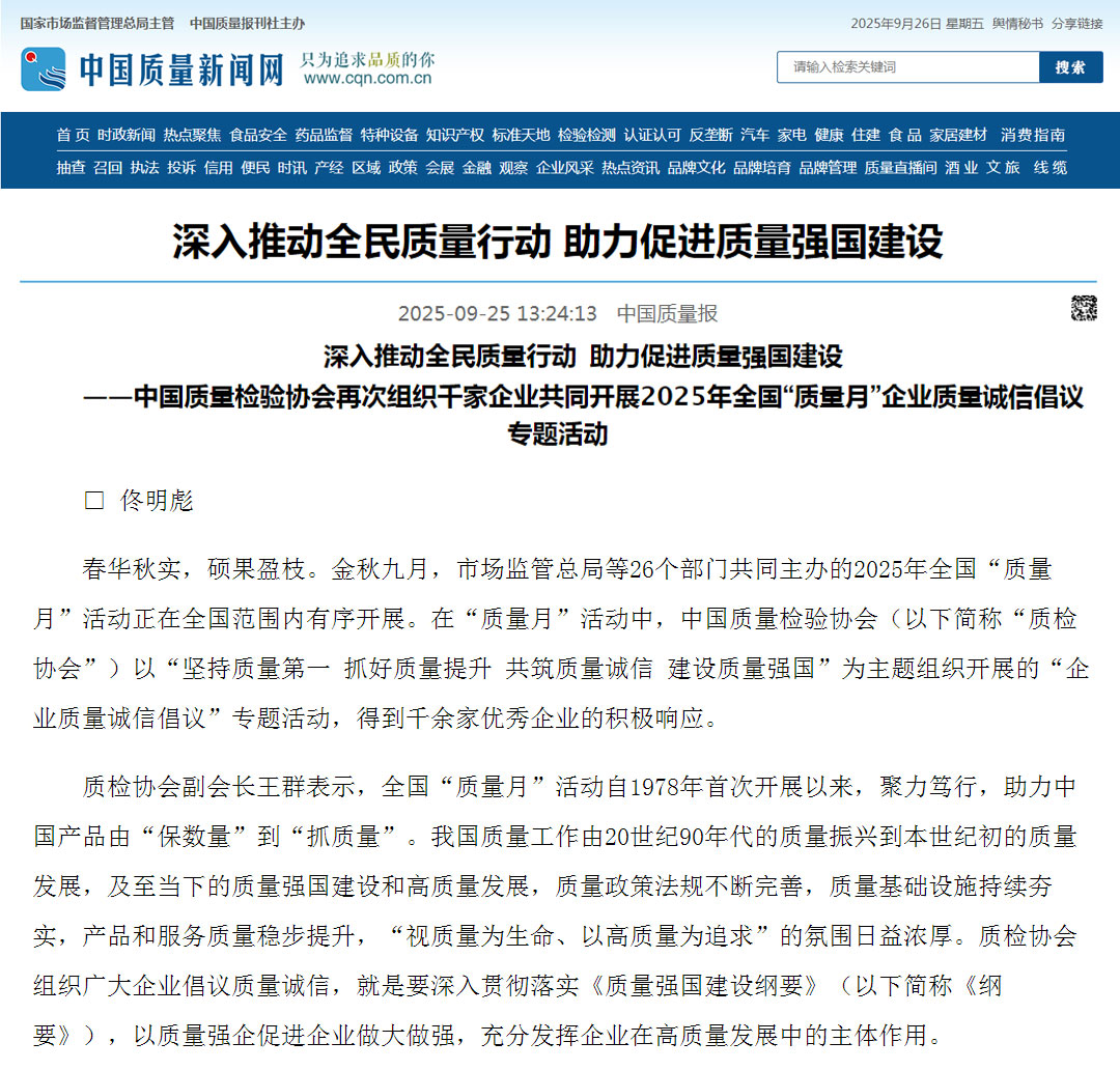 - 《中國質(zhì)量報(bào)》(2025年9月25日刊)發(fā)布:深入推動全民質(zhì)量行動 助力促進(jìn)質(zhì)量強(qiáng)國建設(shè)——中國質(zhì)量檢驗(yàn)協(xié)會再次組織千家企業(yè)共同開展2025年全國“質(zhì)量月”企業(yè)質(zhì)量誠信倡議專題活動