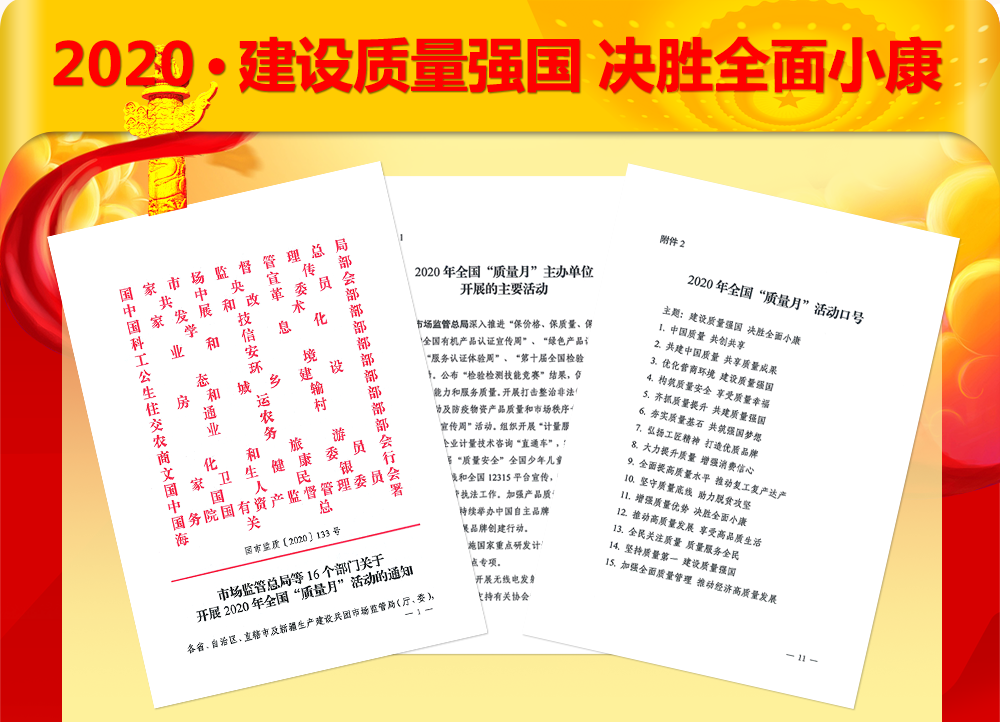 2020年9月,市場監(jiān)管總局聯(lián)合中共中央宣傳部、國家發(fā)展改革委、科技部、工業(yè)和信息化部、公安部、生態(tài)環(huán)境部、住房和城鄉(xiāng)建設(shè)部、交通運(yùn)輸部、農(nóng)業(yè)農(nóng)村部、商務(wù)部、文化和旅游部、國家衛(wèi)生健康委、人民銀行、國務(wù)院國資委、海關(guān)總署等16個部門,共同開展以“建設(shè)質(zhì)量強(qiáng)國 決勝全面小康”為主題的2020年全國“質(zhì)量月”活動。